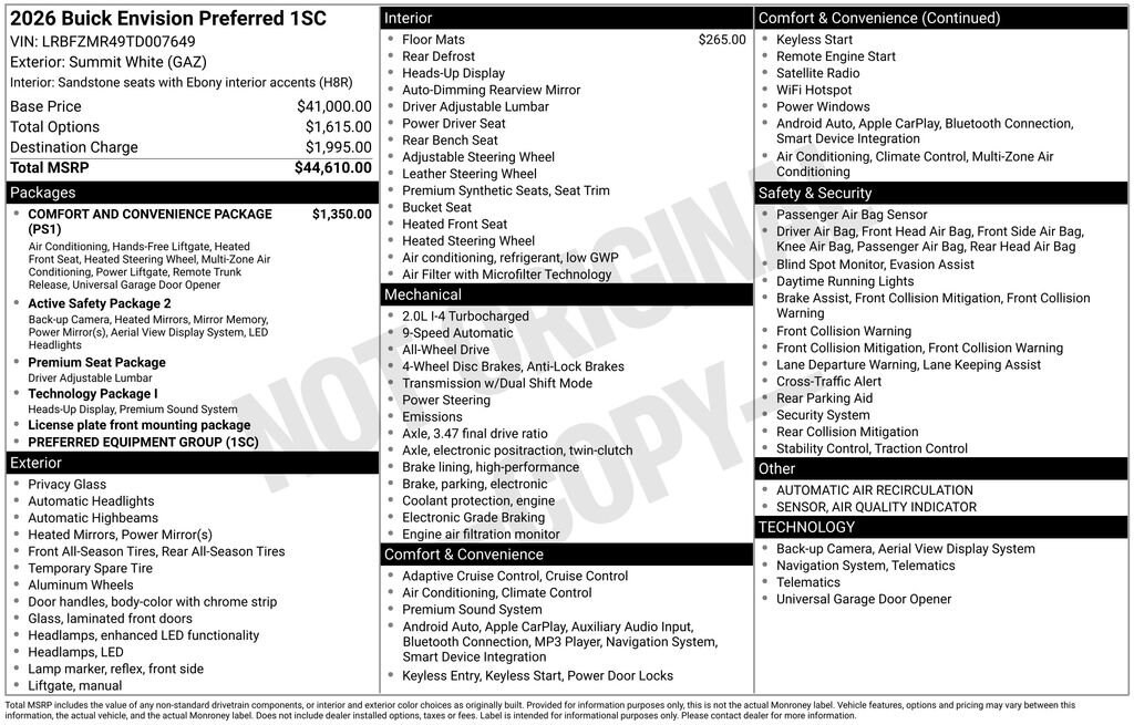 Summit White 2026 Buick Envision Preferred AWD 9-Speed Automatic 2.0L Turbocharged 3-Channel Programmable Universal Home Remote, 30 Diagonal LCD Display, 4-Wheel Disc Brakes, 9 Speakers, ABS brakes, Air Quality Indicator Sensor, AM/FM radio: SiriusXM, Auto High-beam Headlights, Auto-dimming door mirrors, Auto-dimming Rear-View mirror, Automatic Air Recirculation, Automatic temperature control, Bose Premium 9-Speaker Audio System Feature, Brake assist, Comfort and Convenience Package, Delay-off headlights, Driver 4-Way Power Lumbar Seat Adjuster, Driver 8-Way Power Seat Adjuster, Dual front impact airbags, Dual front side impact airbags, Dual-Zone Automatic Climate Control Air Conditioning, Electronic Stability Control, Emergency communication system: OnStar and Buick connected services capable, Exterior Parking Camera Rear, Four wheel independent suspension, Front anti-roll bar, Front Bucket Seats, Front Center Armrest, Front Passenger 6-Way Manual Seat Adjuster, Front reading lights, Fully automatic headlights, Hands-Free Power Programmable Liftgate, Heads-Up Display, Heated door mirrors, Heated Driver and Front Passenger Seats, Heated Steering Wheel, Knee airbag, Leather steering wheel, Low tire pressure warning, Memory seat, Navigation System, Occupant sensing airbag, Outside temperature display, Overhead airbag, Panic alarm, Passenger door bin, Perforated Leatherette Seat Trim, Power door mirrors, Power driver seat, Power Liftgate, Power steering, Power windows, Preferred Equipment Group 1SC, Premium audio system: Buick Infotainment System, Radio: Infotainment Center, Rear anti-roll bar, Rear window defroster, Rear window wiper, Remote keyless entry, Security system, SiriusXM Trial Subscription, Speed control, Split folding rear seat, Steering wheel mounted audio controls, Telescoping steering wheel, Tilt steering wheel, Traction control, Variably intermittent wipers, Wheels: 18 Alloy with Technical Gray, Wireless Apple CarPlay/Wireless Android Auto.