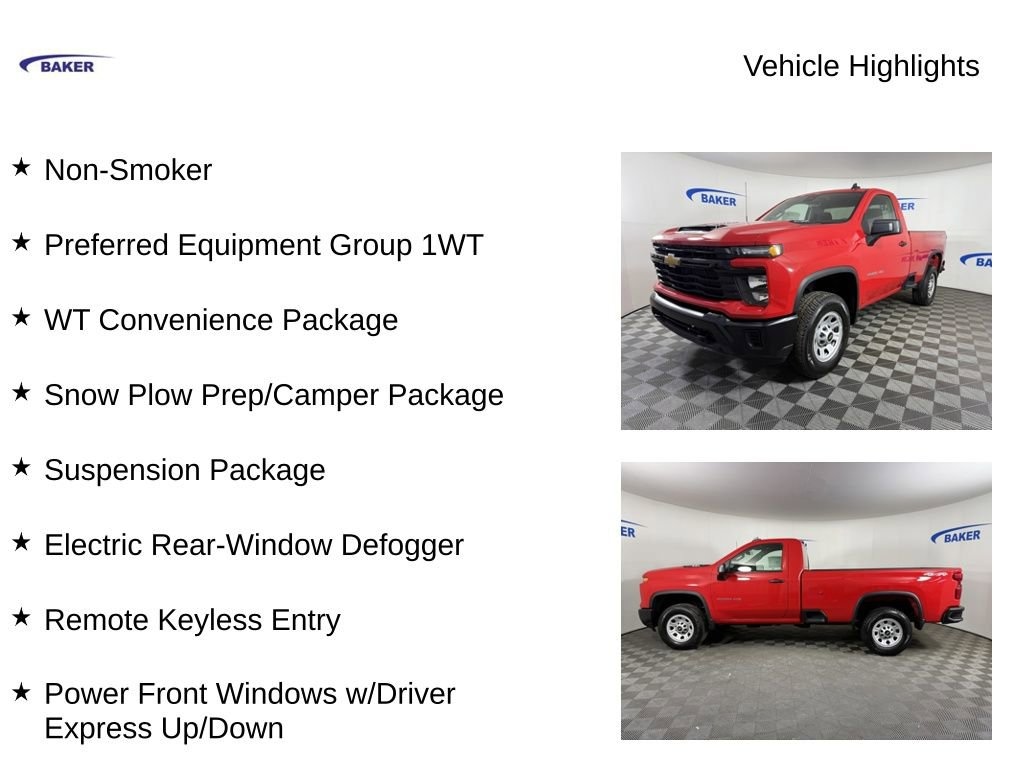 Red Hot 2025 Chevrolet Silverado 2500HD Work Truck 4WD 10-Speed Automatic 6.6L V8 Non-Smoker, Silverado 2500HD Work Truck, 2D Standard Cab, 6.6L V8, 10-Speed Automatic, 4WD, Red Hot, Jet Black w/Cloth Seat Trim, 170 Amp Alternator, 2-Speed Electronic Shift Transfer Case, 220 Amp Alternator, 3.5 Diagonal Monochromatic Display DIC, Black Front Bumper, Black Mirror Caps, Black Rear Bumper, Bluetooth® For Phone, Chevrolet Connected Access Capable, Compass, Deep-Tinted Glass, Electric Rear-Window Defogger, Electronic Cruise Control w/Set & Resume Speed, EZ Lift Power Lock & Release Tailgate, HD Rear Vision Camera, Locking Tailgate, Manual Tailgate Function w/No EZ Lift, Manual Tilt-Wheel Steering Column, OnStar Services Capable, Power Door Locks, Power Front Windows w/Driver Express Up/Down, Preferred Equipment Group 1WT, Push Button Start, Remote Keyless Entry, Rubberized-Vinyl Floor Covering, Snow Plow Prep/Camper Package, Solar Absorbing Tinted Glass, Standard Tailgate, Suspension Package, Wi-Fi Hotspot Capable, Wireless Phone Projection, WT Convenience Package. Price includes: $500 - Customer Cash. Exp. 11/03/2025