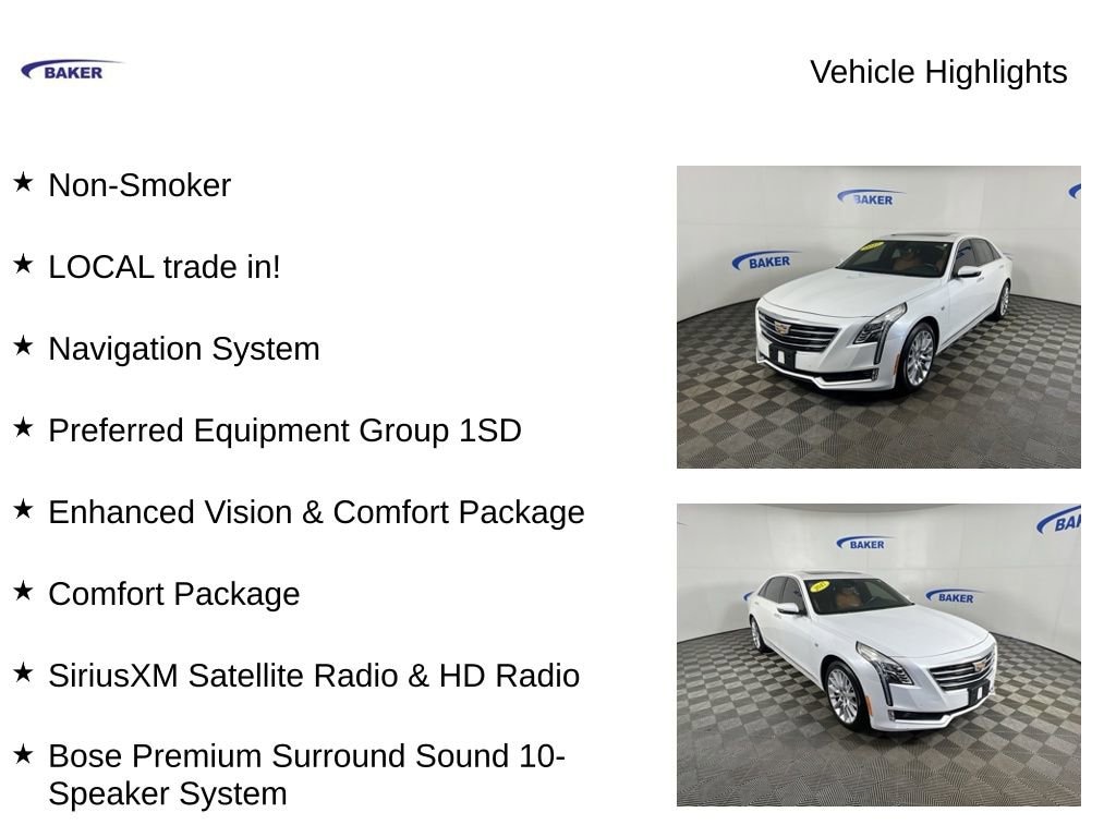 Crystal White 2017 Cadillac CT6 3.6L Luxury AWD 8-Speed Automatic 3.6L V6 SIDI DOHC VVT Non-Smoker, LOCAL trade in!, CT6 3.6L Luxury, 4D Sedan, 3.6L V6 SIDI DOHC VVT, 8-Speed Automatic, AWD, Crystal White, Bose Premium Surround Sound 10-Speaker System, Comfort Package, Dual Zone Automatic Climate Control, Electronic Automatic Cruise Control, Enhanced Vision & Comfort Package, Heated Power-Adjustable Outside Mirrors, Inside Rear-View Auto-Dimming Mirror, Leather Seating Surfaces w/Chevron Perf Inserts, Navigation System, OnStar 1-Year Guidance Plan, OnStar 4G LTE, Preferred Equipment Group 1SD, SiriusXM Satellite Radio & HD Radio, UltraView Power Sunroof, Ventilated Front Seat Cushions & Seatbacks, Wheels: 19 x 8.5 Ultra-Bright Machined Aluminum.CALL US TODAY 6168373800. Recent Arrival! 18/27 City/Highway MPGReviews:* Plenty of rear passenger space for adults; engaging driving experience for a large luxury sedan; V6 engines are respectably powerful and fuel efficient; priced less than many other competing sedans. Source: Edmunds