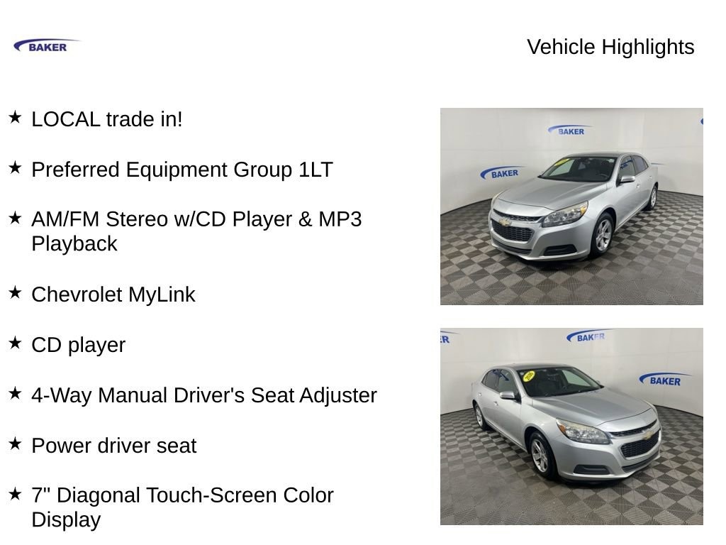 New Price! Silver Ice Metallic 2016 Chevrolet Malibu Limited LT FWD 6-Speed Automatic Electronic with Overdrive 2.5L 4-Cylinder DGI DOHC VVT LOCAL trade in!, Malibu Limited LT, 2.5L 4-Cylinder DGI DOHC VVT, 6-Speed Automatic Electronic with Overdrive, FWD, Silver Ice Metallic, 16 Aluminum Wheels, 4-Way Manual Driver's Seat Adjuster, 4-Way Manual Front Passenger Seat Adjuster, 7 Diagonal Touch-Screen Color Display, AM/FM Stereo w/CD Player & MP3 Playback, CD player, Chevrolet MyLink, Power driver seat, Power passenger seat, Preferred Equipment Group 1LT.CALL US TODAY 6168373800. Recent Arrival! 24/34 City/Highway MPGAwards:* 2016 IIHS Top Safety Pick * 2016 IIHS Top Safety Pick with optional front crash preventionReviews:* Excellent crash test scores; attractive interior; quiet, comfortable ride. Source: Edmunds