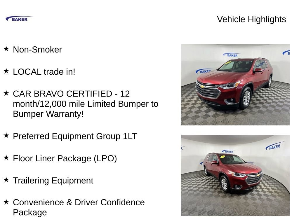 Cajun Red Tintcoat 2020 Chevrolet Traverse LT 1LT FWD 9-Speed Automatic 3.6L V6 SIDI VVT Non-Smoker, LOCAL trade in!, CAR BRAVO CERTIFIED - 12 month/12,000 mile Limited Bumper to Bumper Warranty!, Traverse LT 1LT, 3.6L V6 SIDI VVT, FWD, 1st & 2nd Row All-Weather Floor Liner (LPO), 3rd Row All-Weather Floor Liner (LPO), 4.2 Multi-Color Enhanced Driver Instrument Display, Apple CarPlay/Android Auto, Automatic temperature control, Convenience & Driver Confidence Package, Floor Liner Package (LPO), Front dual zone A/C, Heated Driver & Front Passenger Seats, Heavy-Duty Cooling System, Integrated Cargo Liner (LPO), Lane Change Alert w/Side Blind Zone Alert, Power driver seat, Preferred Equipment Group 1LT, Radio: Chevrolet Infotainment 3 Plus System, Radio: Chevrolet Infotainment System AM/FM Stereo, Rear Cross Traffic Alert, Rear Park Assist w/Audible Warning, Rear Power Liftgate, Remote Start, SiriusXM Radio, Trailering Assist Guidelines, Trailering Equipment, Universal Home Remote, Wheels: 18 Bright Silver Painted Aluminum.