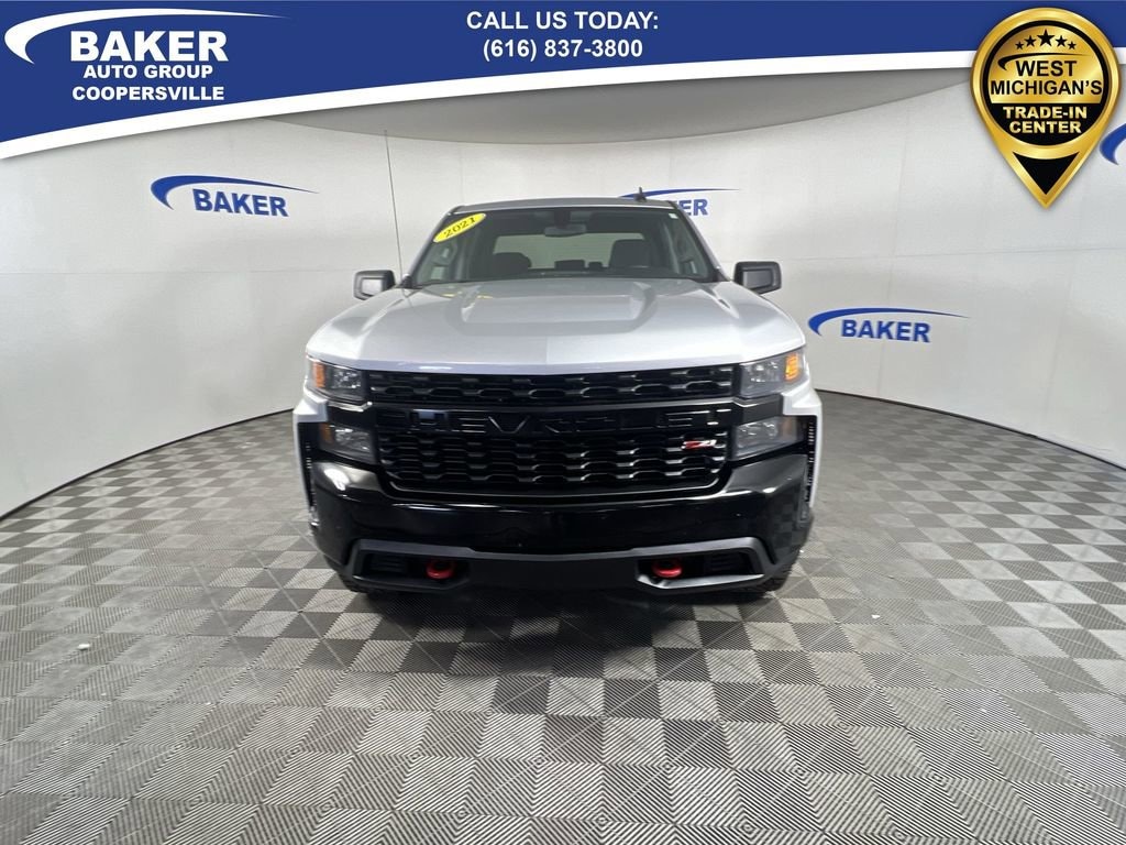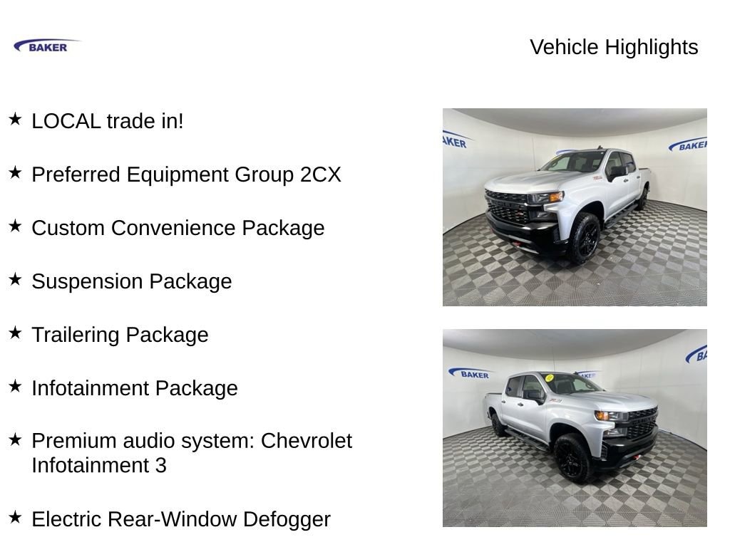 Silver Ice Metallic 2021 Chevrolet Silverado 1500 Custom Trail Boss 4WD 6-Speed Automatic Electronic with Overdrive EcoTec3 5.3L V8 LOCAL trade in!, Silverado 1500 Custom Trail Boss, EcoTec3 5.3L V8, 6-Speed Automatic Electronic with Overdrive, 4WD, Silver Ice Metallic, Black Cloth, 170 Amp Alternator, 3.42 Rear Axle Ratio, Apple CarPlay/Android Auto, Auto-Locking Rear Differential, Bluetooth® For Phone, Color-Keyed Carpeting Floor Covering, Custom Convenience Package, Deep-Tinted Glass, Electric Rear-Window Defogger, EZ Lift Power Lock & Release Tailgate, Front Rubberized Vinyl Floor Mats, Hitch Guidance, Infotainment Package, Integrated Trailer Brake Controller, Off-Road Suspension w/2 Lift, OnStar & Chevrolet Connected Services Capable, Performance Red Recovery Hooks, Polished Exhaust Tip, Power Door Locks, Preferred Equipment Group 2CX, Premium audio system: Chevrolet Infotainment 3, Rear 60/40 Folding Bench Seat (Folds Up), Remote Keyless Entry, Remote Vehicle Starter System, Standard Tailgate, Suspension Package, Trailering Package, Wheels: 20 x 9 High Gloss Black Painted Alum.CALL US TODAY 6168373800. Recent Arrival!