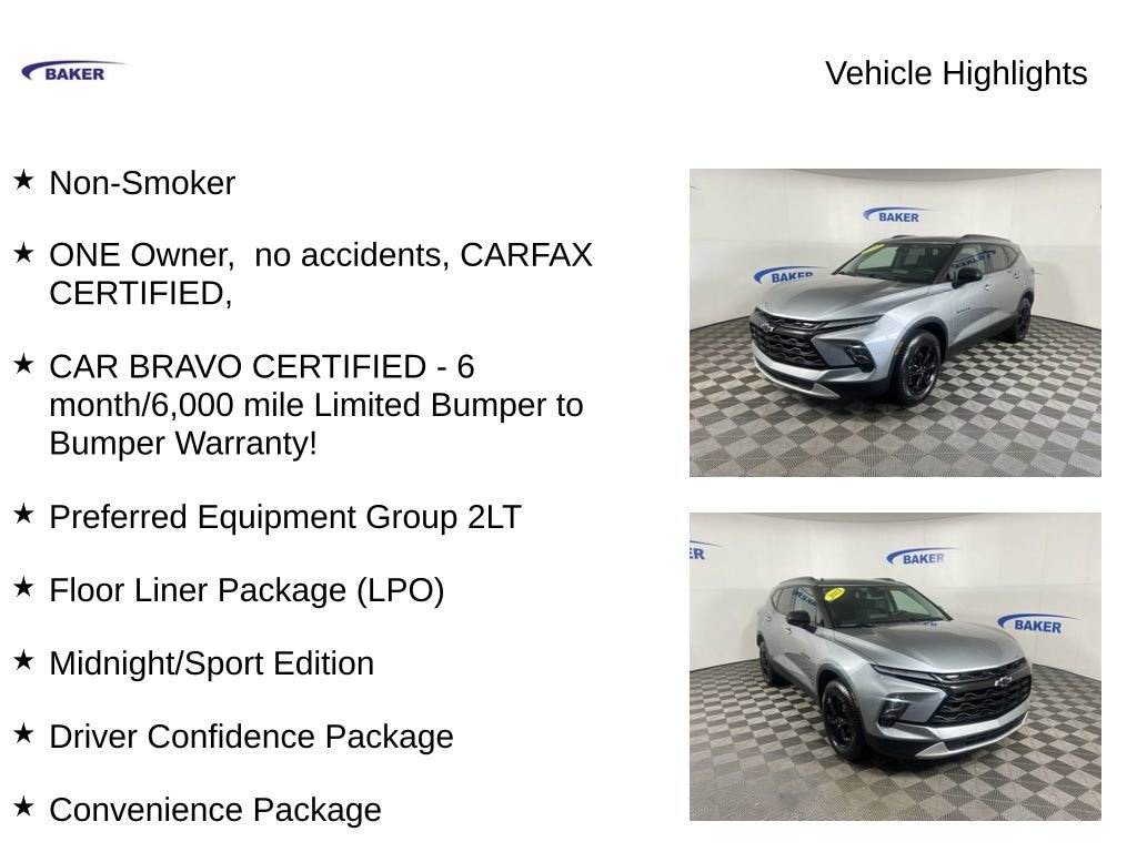 Sterling Metallic 2023 Chevrolet Blazer LT AWD 9-Speed Automatic with Overdrive 2.0L Turbocharged Non-Smoker, ONE Owner, no accidents, CARFAX CERTIFIED,, CAR BRAVO CERTIFIED - 6 month/6,000 mile Limited Bumper to Bumper Warranty!, Blazer LT, 2.0L Turbocharged, 9-Speed Automatic with Overdrive, AWD, Sterling Metallic, Jet Black Cloth, 1st & 2nd Row All-Weather Floor Liners (LPO), 4-Way Manual Front Passenger Seat Adjuster, 6 Speakers, 8-Way Power Driver Seat Adjuster, Adaptive Cruise Control, Apple CarPlay/Android Auto, Automatic temperature control, Black Roof-Mounted Side Rails, Convenience Package, Driver Confidence Package, Enhanced Automatic Emergency Braking, Floor Liner Package (LPO), Front & Rear Black Bowties, Heated Driver & Front Passenger Seats, Inside Rear-View Auto-Dimming Mirror, Integrated Cargo Liner (LPO), Lane Change Alert w/Side Blind Zone Alert, Midnight/Sport Edition, Power Driver Lumbar Control, Power driver seat, Preferred Equipment Group 2LT, Premium audio system: Chevrolet Infotainment 3 Plus, Rear Cross Traffic Alert, Rear Park Assist w/Audible Warning, Rear Power Programmable Liftgate, Universal Home Remote, Wheels: 18 High Gloss Black Painted Aluminum, Wireless Charging.