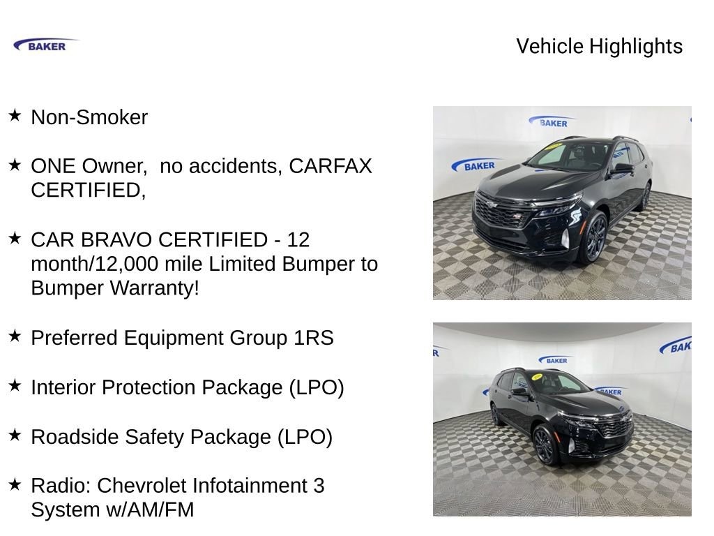 New Price! Certified. Mosaic Black Metallic 2024 Chevrolet Equinox RS AWD 6-Speed Automatic Electronic with Overdrive 1.5L DOHC Non-Smoker, ONE Owner, no accidents, CARFAX CERTIFIED,, CAR BRAVO CERTIFIED - 12 month/12,000 mile Limited Bumper to Bumper Warranty!, Equinox RS, 4D Sport Utility, 1.5L DOHC, AWD, Mosaic Black Metallic, 19 Aluminum Wheels, 2 Rear USB Charging-Only Ports, 2 USB Ports & Auxiliary Input Jack, 2-Way Power Driver Lumbar Control Seat Adjuster, 6-Speaker Audio System Feature, All-Weather Floor Mats, Automatic temperature control, Bluetooth® For Phone, Driver 8-Way Power Seat Adjuster, First Aid Kit (LPO), Front dual zone A/C, Front Passenger 4-Way Manual Seat Adjuster, Heated front seats, Highway Safety Kit, Interior Protection Package (LPO), Power driver seat, Power Liftgate, Power Sunroof, Preferred Equipment Group 1RS, Radio: Chevrolet Infotainment 3 System w/AM/FM, Roadside Safety Package (LPO).
