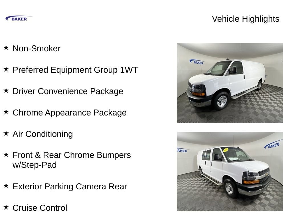 New Price! Summit White 2024 Chevrolet Express 2500 Work Van Cargo RWD 8-Speed Automatic with Overdrive 4.3L V6 Non-Smoker, Express 2500 Work Van Cargo, 4.3L V6, 8-Speed Automatic with Overdrive, RWD, Summit White, Jet Black/Medium Dark Pewter Cloth, 16 x 6.5 Steel Wheels, 3.42 Rear Axle Ratio, Air Conditioning, Chrome Appearance Package, Chrome Grille, Cruise Control, Driver & Front Passenger High-Back Bucket Seats, Driver Convenience Package, Engine Cover Console w/Swing-Out Storage Bin, Exterior Parking Camera Rear, Fixed Rear Door Window Glass, Fixed Rear Side Door Window Glass, Front & Rear Chrome Bumpers w/Step-Pad, Preferred Equipment Group 1WT, Rear & Side Cargo Door Glass, Rear Side Door Glass Window Security Bar.