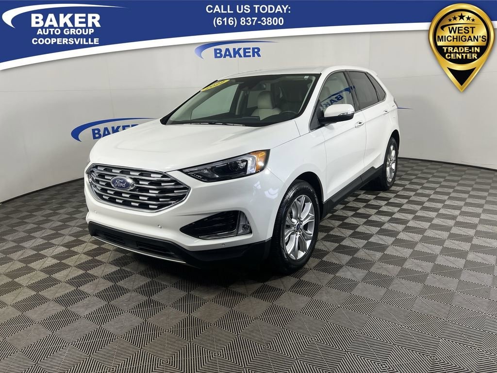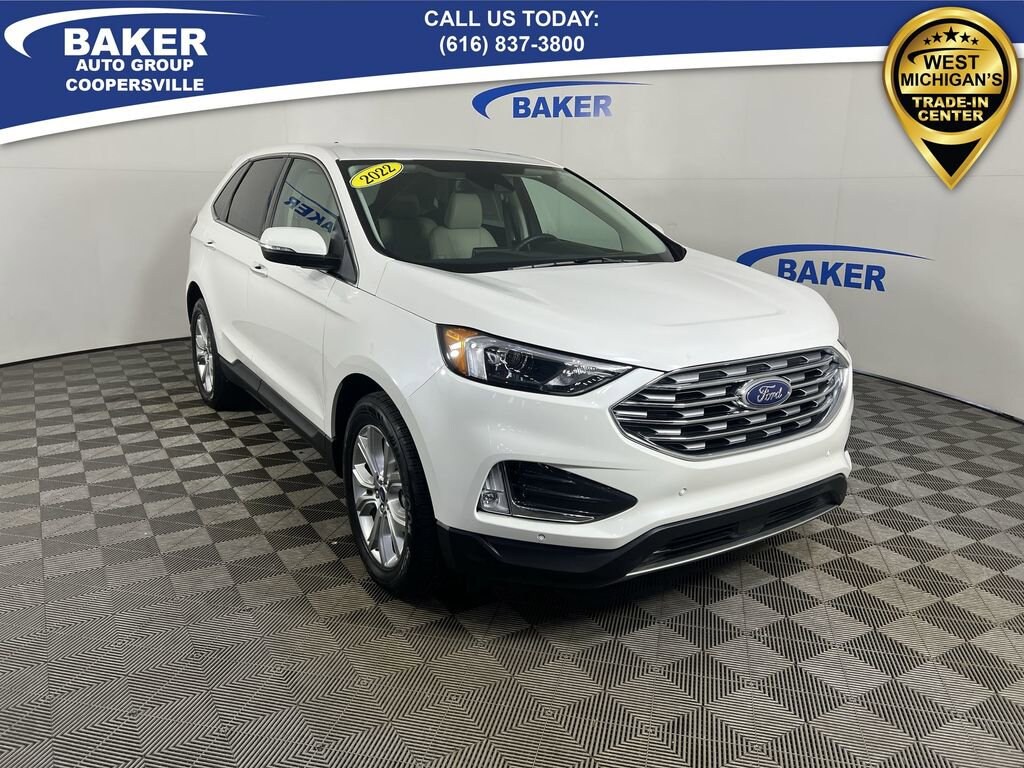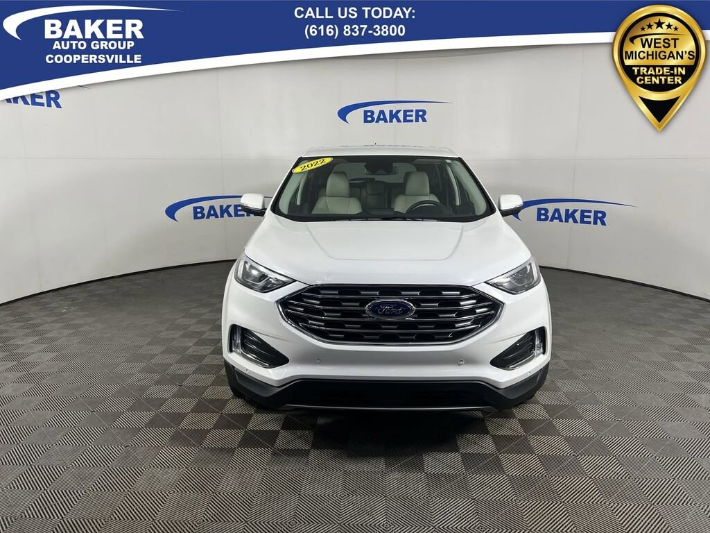 Star White Metallic Tri-Coat 2022 Ford Edge Titanium AWD 8-Speed Automatic EcoBoost 2.0L I4 GTDi DOHC Turbocharged VCT Non-Smoker, LOCAL trade in!, CAR BRAVO CERTIFIED - 12 month/12,000 mile Limited Bumper to Bumper Warranty!, Edge Titanium, EcoBoost 2.0L I4 GTDi DOHC Turbocharged VCT, AWD, Star White Metallic Tri-Coat, Ceramic Leather, Adaptive Cruise Control w/Stop & Go, Automatic temperature control, Connected Built-In Navigation, Equipment Group 300A, Evasive Steering Assist, Ford Co-Pilot360 Assist+, FordPass Connect, Front dual zone A/C, Heated front seats, Heated steering wheel, Lane Centering, Memory seat, Power driver seat, Power Liftgate, Power passenger seat, Radio: B&O Sound System by Bang & Olufsen, SYNC 4A w/Enhanced Voice Recognition, Wheels: 19 Luster Nickel-Painted Aluminum.