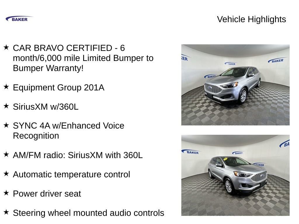 New Price! Silver Metallic 2024 Ford Edge SEL AWD 8-Speed Automatic EcoBoost 2.0L I4 GTDi DOHC Turbocharged VCT CAR BRAVO CERTIFIED - 6 month/6,000 mile Limited Bumper to Bumper Warranty!, Edge SEL, 4D Sport Utility, EcoBoost 2.0L I4 GTDi DOHC Turbocharged VCT, AWD, Silver Metallic, Ebony Premium Synthetic, ActiveX Trimmed Heated Bucket Seats, AM/FM radio: SiriusXM with 360L, Automatic temperature control, Equipment Group 201A, FordPass Connect, Front Bucket Seats, Heated front seats, Power driver seat, Rear Parking Sensors, SiriusXM w/360L, Steering wheel mounted audio controls, SYNC 4A w/Enhanced Voice Recognition, Wheels: 18 Sparkle Silver-Painted Aluminum.