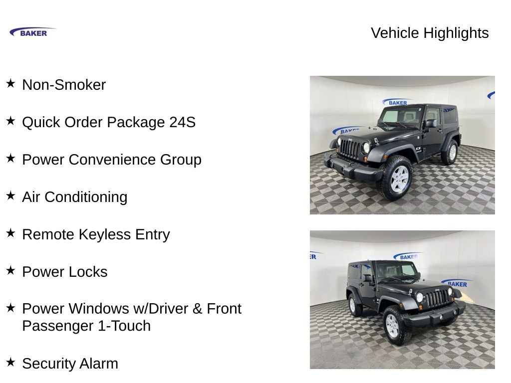 New Price! Black Clearcoat 2009 Jeep Wrangler X 4WD 4-Speed Automatic VLP 3.8L V6 SMPI Non-Smoker, Wrangler X, 2D Sport Utility, 3.8L V6 SMPI, 4-Speed Automatic VLP, 4WD, 17 x 7.5 Aluminum Wheels, Air Conditioning, Cloth Bucket Seats, Fog Lamps, Front Floor Mats, Full Length Floor Console, Leather Wrapped Steering Wheel, Power Convenience Group, Power Locks, Power Windows w/Driver & Front Passenger 1-Touch, Quick Order Package 24S, Remote Keyless Entry, Security Alarm, Speed Control, Temperature & Compass Gauge, Tow Hooks (2 front/1 rear).