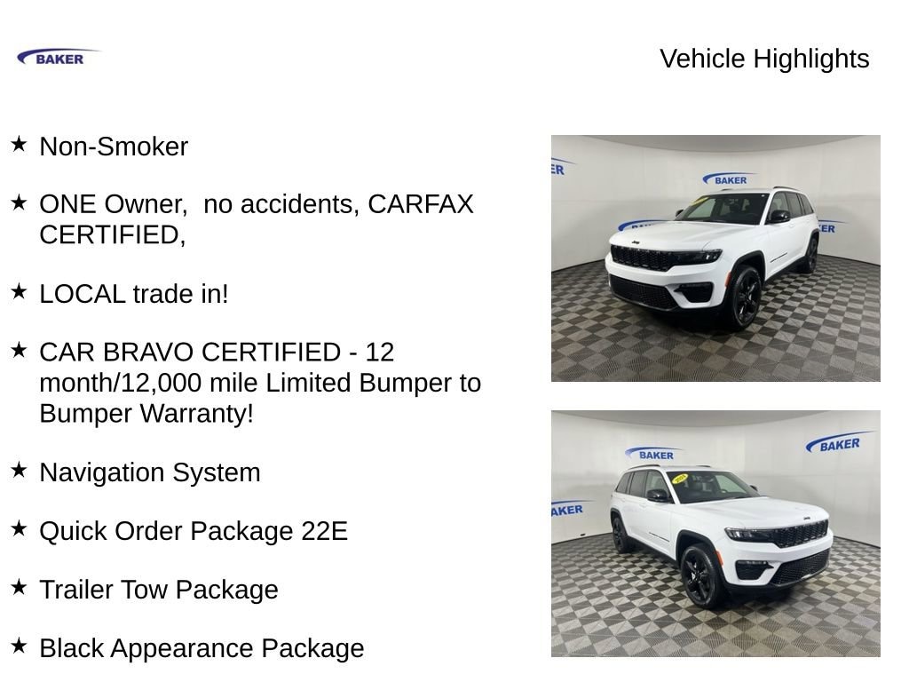 Bright White Clearcoat 2024 Jeep Grand Cherokee Limited 4WD 8-Speed Automatic 3.6L V6 24V VVT Non-Smoker, ONE Owner, no accidents, CARFAX CERTIFIED,, LOCAL trade in!, CAR BRAVO CERTIFIED - 12 month/12,000 mile Limited Bumper to Bumper Warranty!, Grand Cherokee Limited, 4D Sport Utility, 3.6L V6 24V VVT, 8-Speed Automatic, 4WD, Bright White Clearcoat, Global Black Artificial Leather, 220 Amp Alternator, 7 & 4-Pin Wiring Harness, Automatic Headlamp Levelling System, Black Appearance Package, Class IV Receiver Hitch, Dual-Pane Panoramic Sunroof, Gloss Black Exterior Accents, Heated front seats, Heated rear seats, Heavy-Duty Engine Cooling, Navigation System, Power Liftgate, Quick Order Package 22E, Rear Load Levelling Suspension, Trailer Hitch Zoom, Trailer Tow Package, Wheels: 20 x 8.5 Gloss Black Painted Aluminum.