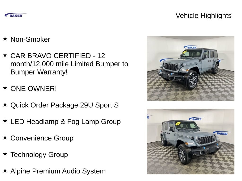 New Price! Anvil Clear Coat 2024 Jeep Wrangler Sport S 4xe 4WD 8-Speed Automatic 2.0L I4 DOHC Non-Smoker, CAR BRAVO CERTIFIED - 12 month/12,000 mile Limited Bumper to Bumper Warranty!, ONE OWNER!, Wrangler Sport S 4xe, 4D Sport Utility, 2.0L I4 DOHC, 8-Speed Automatic, 4WD, Anvil Clear Coat, Black Cloth, 2-Door Passive Entry, Front Door Locks, Alpine Premium Audio System, Black 3-Piece Hard Top, Convenience Group, Emergency/Assistance Call, EV/PHEV Vehicle To Load, Freedom Panel Storage Bag, Front LED Fog Lamps, Heated Front Seats, Heated Steering Wheel, LED Headlamp & Fog Lamp Group, LED Premium Reflector Headlamps, No Soft Top, Quick Order Package 29U Sport S, Rear Window Defroster, Rear Window Wiper/Washer, Remote Start System, Technology Group, Universal Garage Door Opener, Wheels: 20 x 8 Machined/Painted Gray.